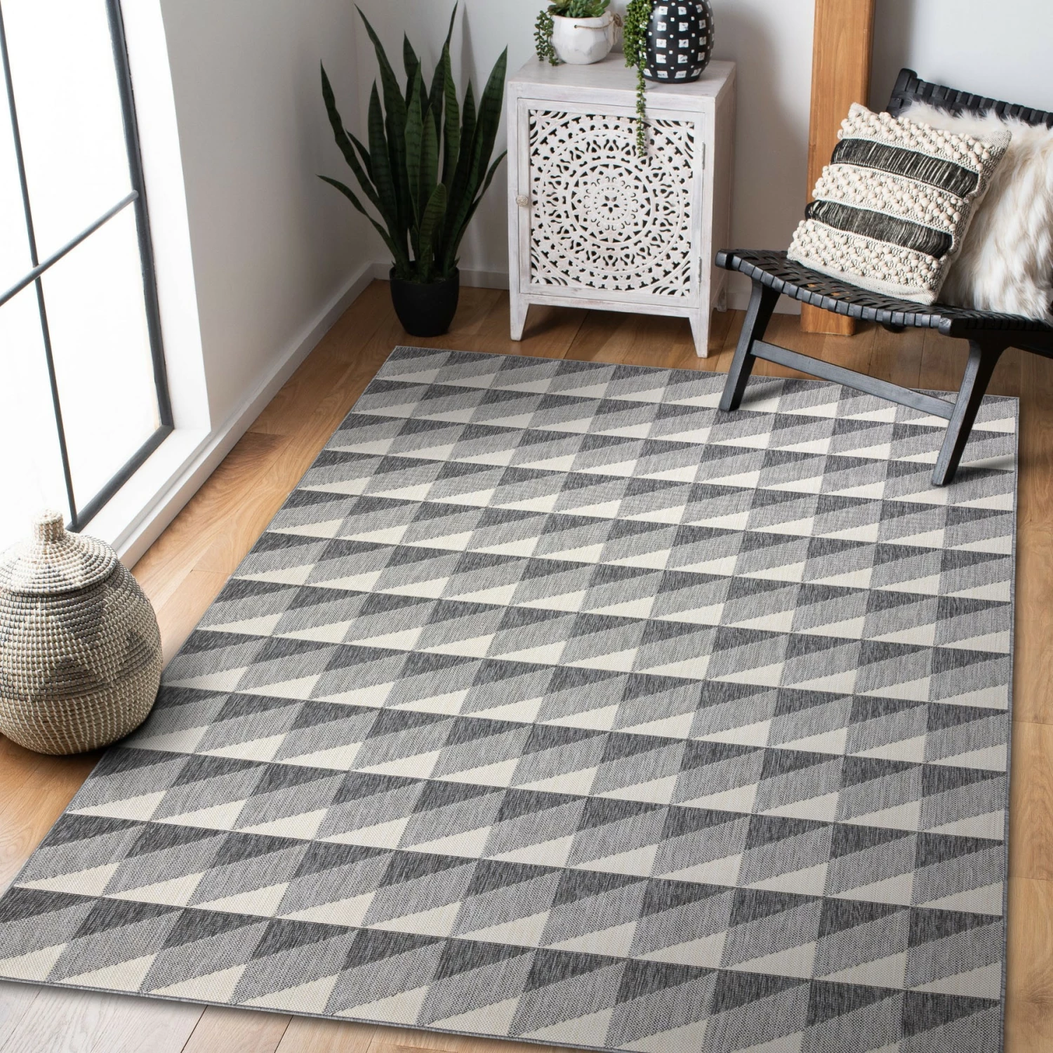 ▪ Zusammensetzung: 100% Polypropylen Ein Universalteppich, der Ihr Haus und Ihre Terrasse verändern wirdTeppiche sind wahrscheinlich die beliebteste Innendekoration. Sie sind in fast jedem Haus zu finden.Sie bringen eine gemütliche Atmosphäre und wärmen den Innenraum zusätzlich.Man kann sie auch benutzen, um den Boden, den man nicht mag, oder Kratzer auf den Platten zu verdecken.Heutzutage können wir Teppiche auch auf Balkonen und Terrassen sehen.Es ist ein neuer Trend, aber wir unterstützen ihn voll und ganz, deshalb präsentieren wir die neue SPRING-Kollektion – Teppiche, die sowohl für den Innen- als auch für den Außenbereich geeignet sind.Die SPRING-Schlingenteppiche gehören zu den widerstandsfähigsten Produkten dieser Art, wenn es um mechanische Beschädigungen geht.Die eingewickelten Fasern bilden eine Barriere gegen Schmutz und Wasser. Auch Menschen, die mit Haustieren leben, werden diese Art des Webens lieben.Der Schlingenteppich bildet eine ideale Barriere für Tierhaare und macht die Reinigung einfach und schnell.Schlingenteppiche sind eine perfekte Ergänzung für Küche, Flur, Korridor, Balkon oder Terrasse.Die bei der Herstellung verwendeten synthetischen Borsten sind wasser- und UV-beständig, so dass der Teppich bedenkenlos auch außerhalb des Hauses verwendet werden kann.Charakteristische Merkmale des Schlingenteppichs SPRING:- Die graue Farbe wird den Charakter des Interieurs schön betonen, das geometrische Muster wird den Innenraum optisch größer werden lassen- Das zur Herstellung verwendete Polypropylen ist für Allergiker und Kinder unbedenklich- Die Schlingenwebung des Teppichs macht ihn sehr langlebig und witterungsbeständig- Sehr pflegeleicht – ein feuchtes Tuch genügt, um Flecken und Schmutz zu entfernen- Er hat das OEKO-TEX-Zertifikat, das eine für Mensch und Umwelt sichere Zusammensetzung gewährleistet